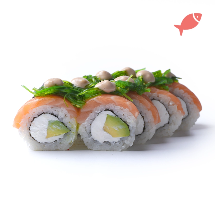 Рис, норі, крем-сир, авокадо, лосось, чука, соус горіховий, кунжут.*До замовлення видаємо набір: соєвий соус, палички, імбир та васабі. У кошику можна вказати кількість потрібних наборів.