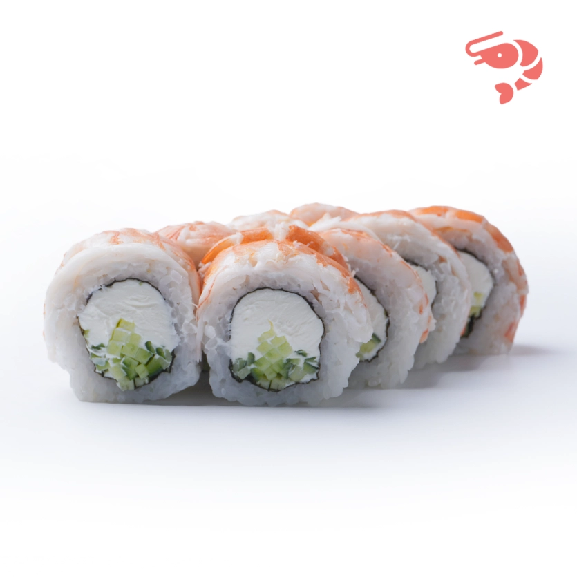 Рис, норі, крем-сир, огірок, креветка.*До замовлення видаємо набір: соєвий соус, палички, імбир та васабі. У кошику можна вказати кількість потрібних наборів.