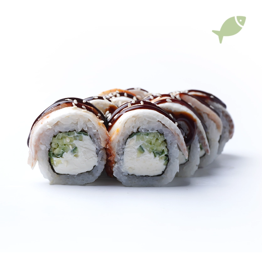 Рис, норі, крем-сир, огірок, вугор, унагі соус, кунжут.*До замовлення видаємо набір: соєвий соус, палички, імбир та васабі. У кошику можна вказати кількість потрібних наборів.