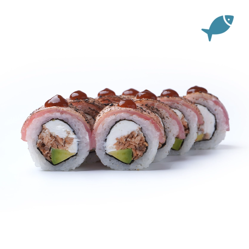 Рис, норі, крем-сир, лосось печений, авокадо, тунець гриль, чорний перець, соус понзу.*До замовлення видаємо набір: соєвий соус, палички, імбир та васабі. У кошику можна вказати кількість потрібних наборів.