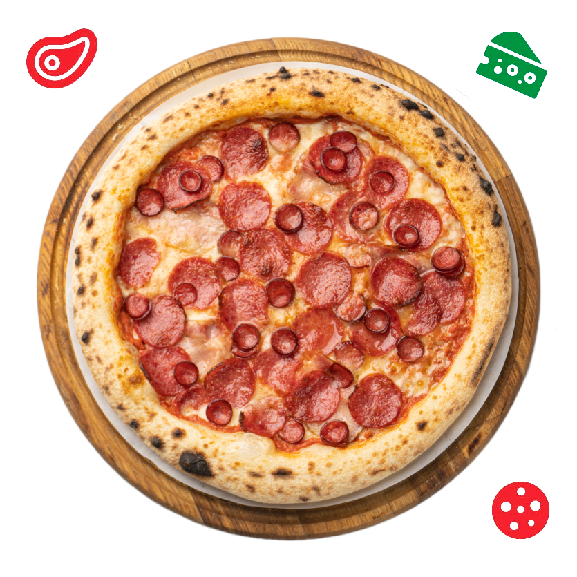 Салямі чорізо, бекон, ковбаски, сир моцарела, неаполітанський соус.