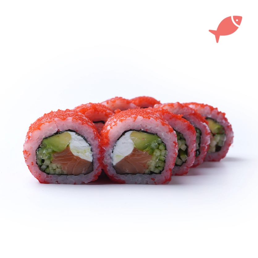 Рис, норі, лосось, крем-сир, огірок, авокадо, масаго.*До замовлення видаємо набір: соєвий соус, палички, імбир та васабі. У кошику можна вказати кількість потрібних наборів.