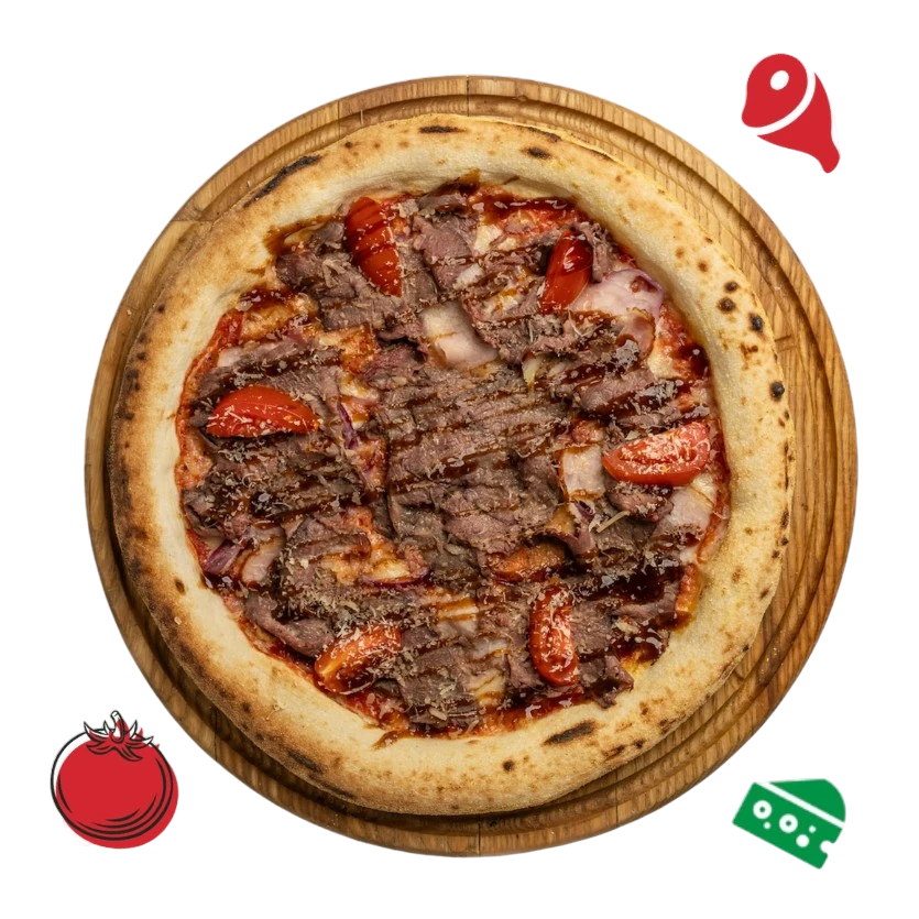 Бекон, сир моцарела, цибуля маринована, ростбіф, помідор чері, пармезан, соус неаполітанський, соус BBQ.