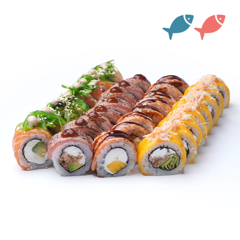 Запечений Бо з креветкою, Аяме Лайт, Запечений з крабом, Філадельфія Класік, Каліфорнія Кіото, Каліфорнія з тунцем.*До замовлення видаємо набори: соєвий соус, палички, імбир та васабі. У кошику можна вказати кількість потрібних наборів.