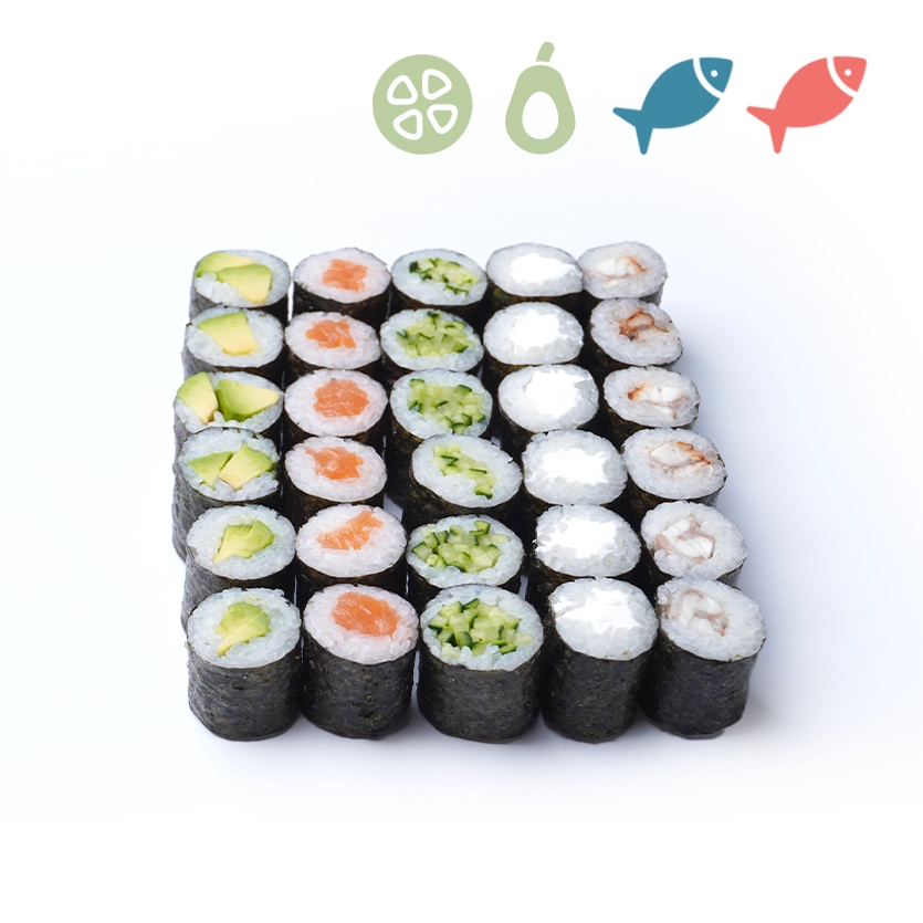 Макі з лососем, Макі з авокадо, Макі з філадельфією, Макі з огірком, Макі з вугрем.*До замовлення видаємо набори: соєвий соус, палички, імбир та васабі. У кошику можна вказати кількість потрібних наборів.