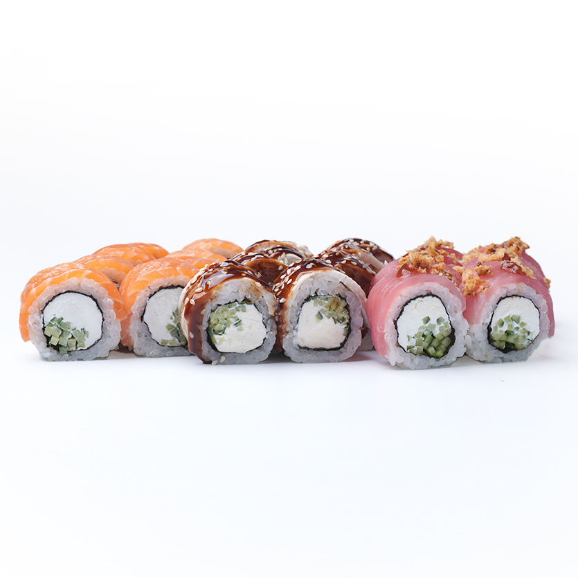 Філадельфія з лососем, Філадельфія з тунцем, Запечений з крабом, Запечений МА з креветкою, Каліфорнія Делюкс, Каліфорнія з вугрем. *До замовлення видаємо набори: соєвий соус, палички, імбир та васабі. У кошику можна вказати кількість потрібних наборів.