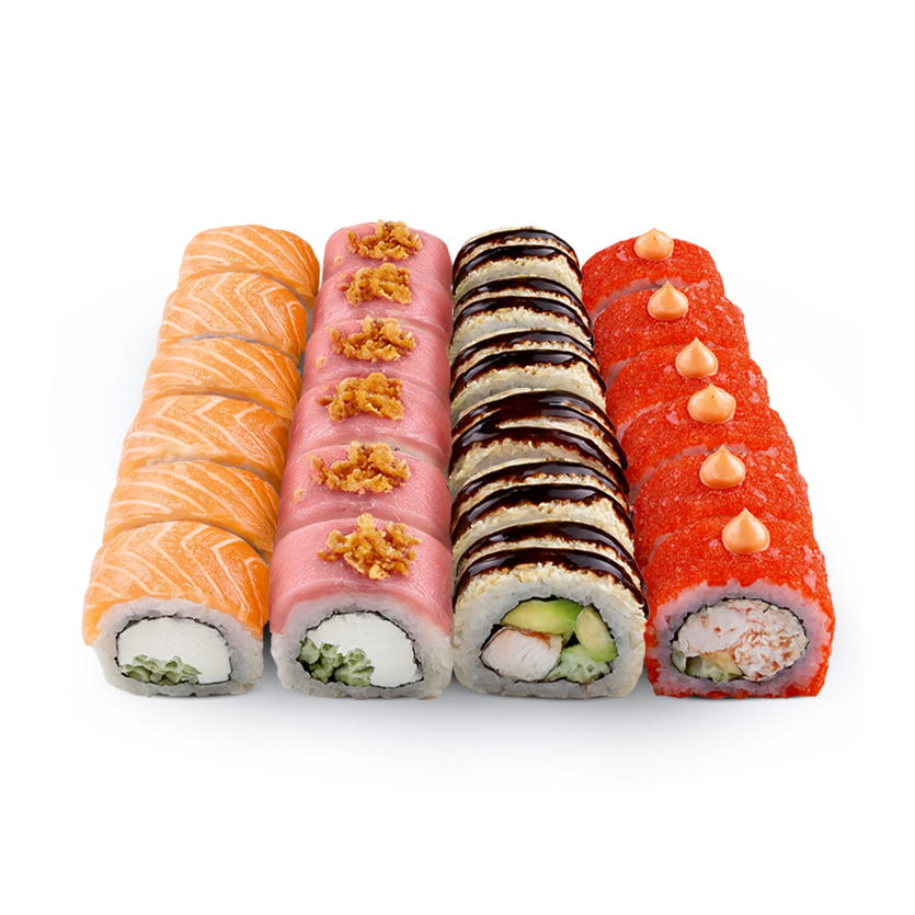 Філадельфія з лососем, Філадельфія з тунцем, Каліфорнія Делюкс, Каліфорнія з вугрем. *До замовлення видаємо набори: соєвий соус, палички, імбир та васабі. У кошику можна вказати кількість потрібних наборів.