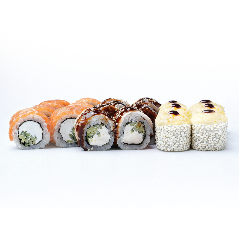 Філадельфія з лососем, Філадельфія з тунцем, Філадельфія з вугрем, Запечений з крабом, Запечений Бо з креветкою. *До замовлення видаємо набори: соєвий соус, палички, імбир та васабі. У кошику можна вказати кількість потрібних наборів.