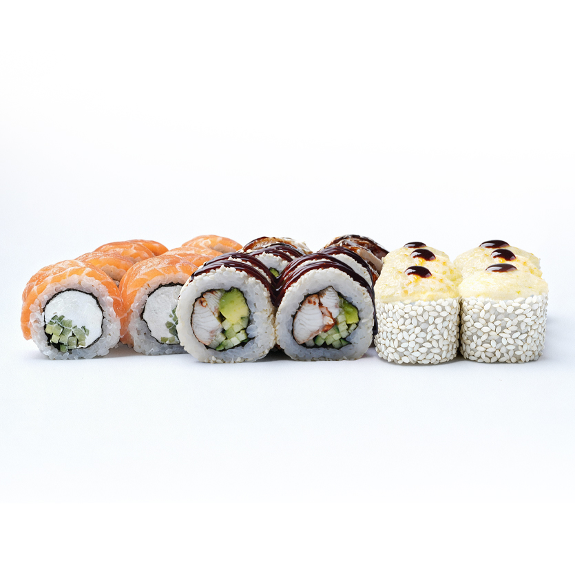 Філадельфія з лососем, Філадельфія з тунцем, Запечений з крабом, Запечений МА з креветкою, Каліфорнія Делюкс, Каліфорнія з вугрем. *До замовлення видаємо набори: соєвий соус, палички, імбир та васабі. У кошику можна вказати кількість потрібних наборів.
