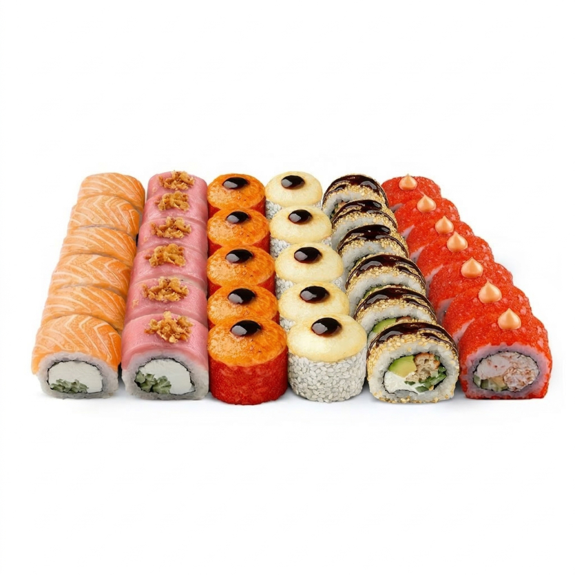 Філадельфія з лососем, Філадельфія з тунцем, Запечений з крабом, Запечений МА з креветкою, Каліфорнія Делюкс, Каліфорнія з вугрем.*До замовлення видаємо набори: соєвий соус, палички, імбир та васабі. У кошику можна вказати кількість потрібних наборів.
