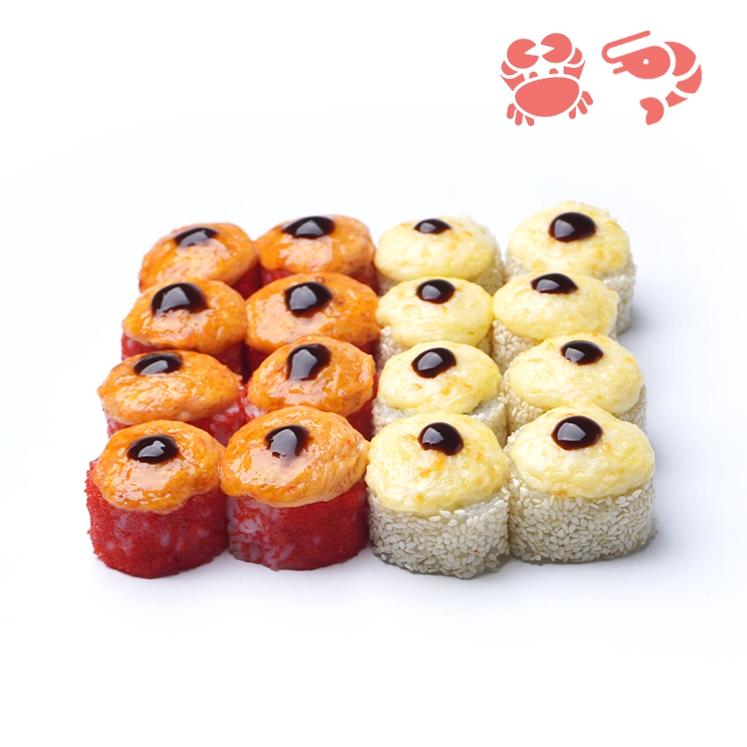 Запечений Бо з креветкою, Запечений з крабом.*До замовлення видаємо набори: соєвий соус, палички, імбир та васабі. У кошику можна вказати кількість потрібних наборів.