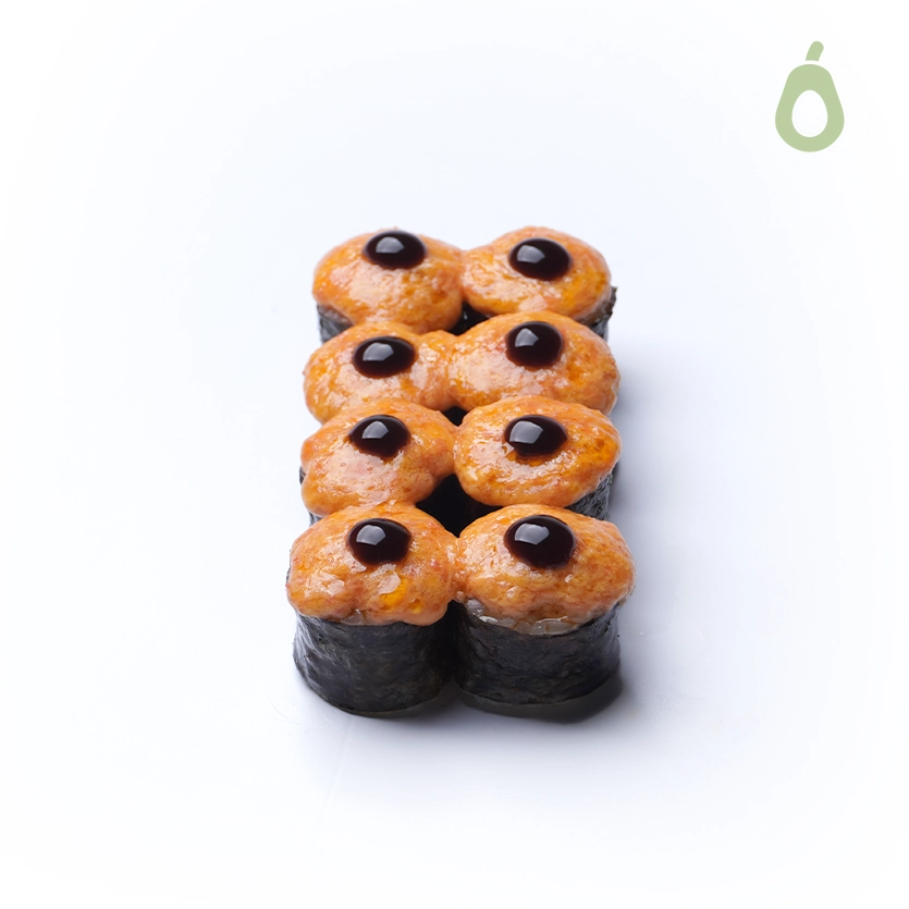 Рис, норі, краб, креветка, авокадо, масаго, соус спайсі.*До замовлення видаємо набір: соєвий соус, палички, імбир та васабі. У кошику можна вказати кількість потрібних наборів.